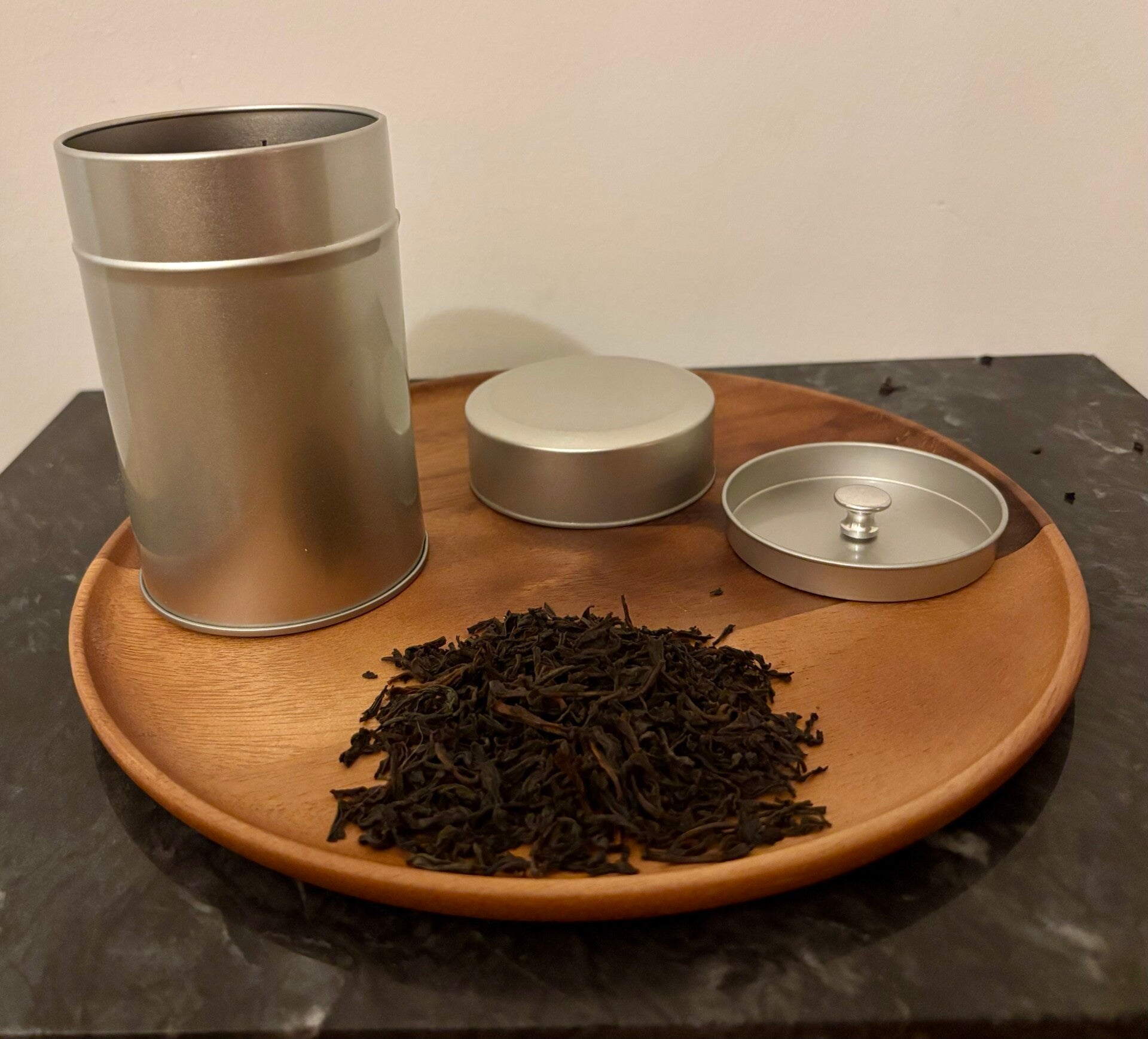 Prachtig matzilverkleurig theeblikje met binnendeksel.